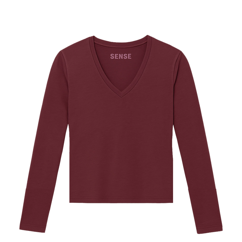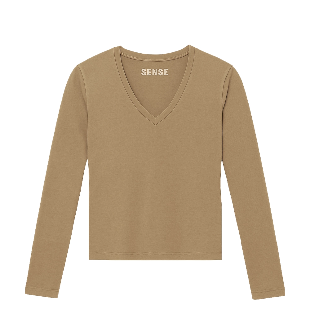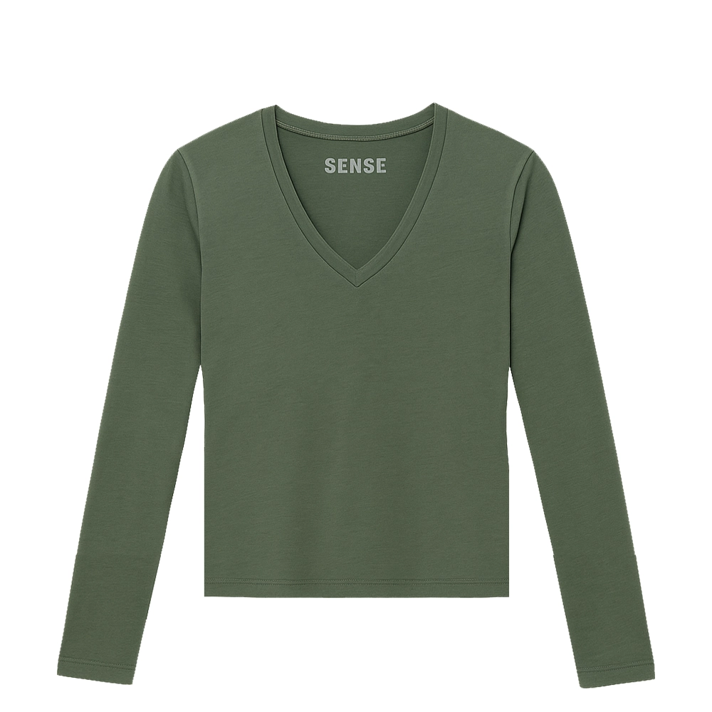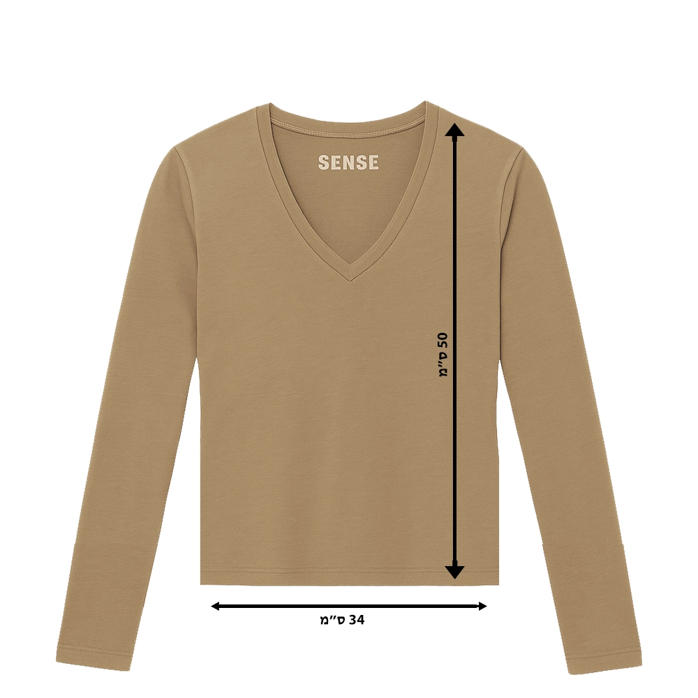 הגזרה המחמיאה בשרוול ארוך, הצווארון וי רחב והבד האיכותי